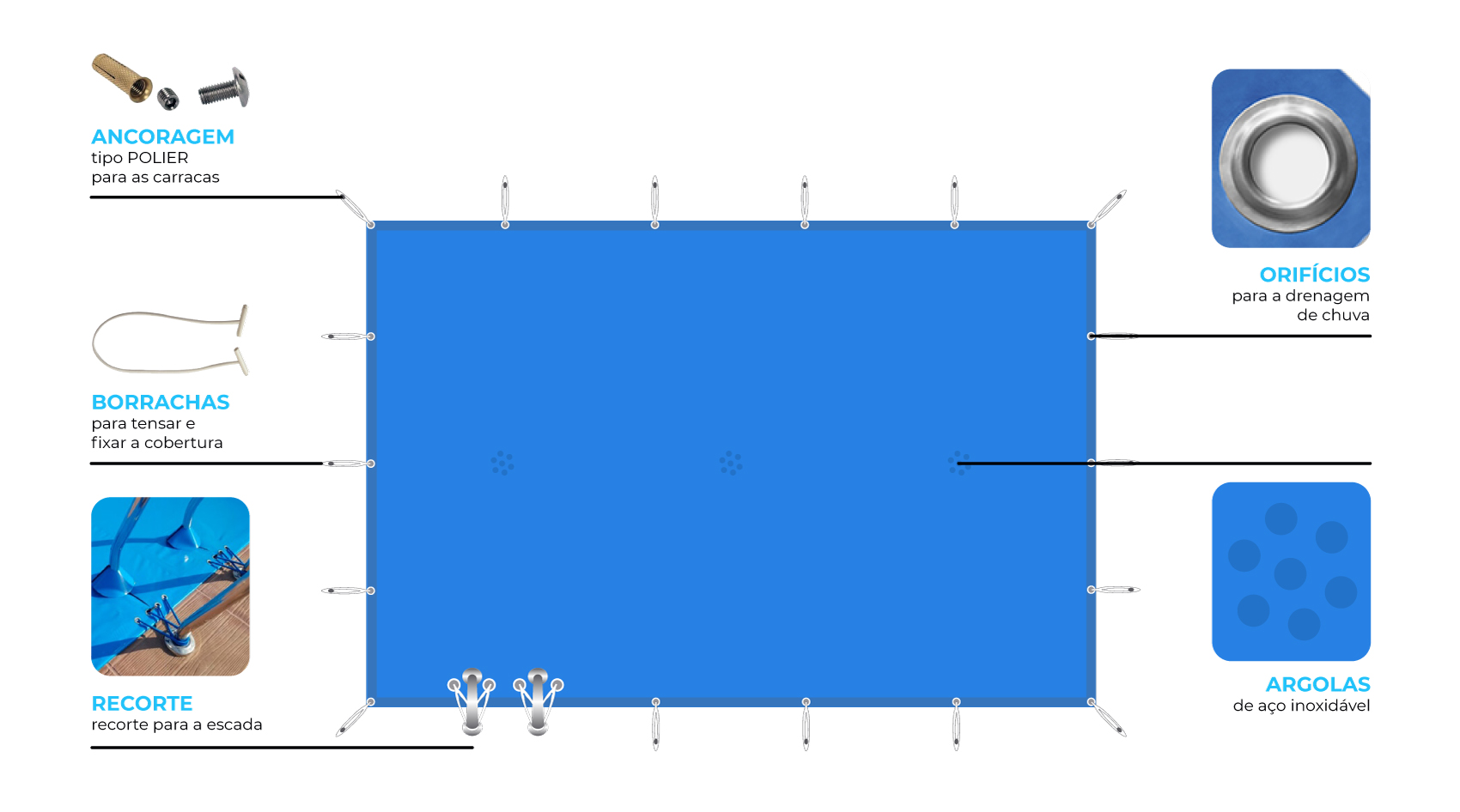 A montagem da cobertura de inverno é super simples. Junto à cobertura virá todos os acessórios necessários para a sua instalação. Caso a sua piscina tiver uma escada, poderá indicar e faremos um recorte para que possa instalar a cobertura sem problema.