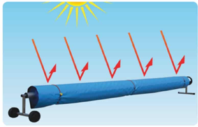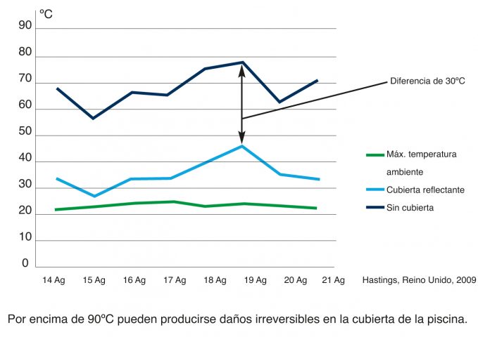 A capa de proteção solar refletora tem uma superfície azul clara que reflete o calor do sol e um fundo preto que impede a luz de penetrar na cobertura da piscina. Esta combinação única demonstrou reduzir a temperatura da cobertura de uma piscina em mais de 30ºC.